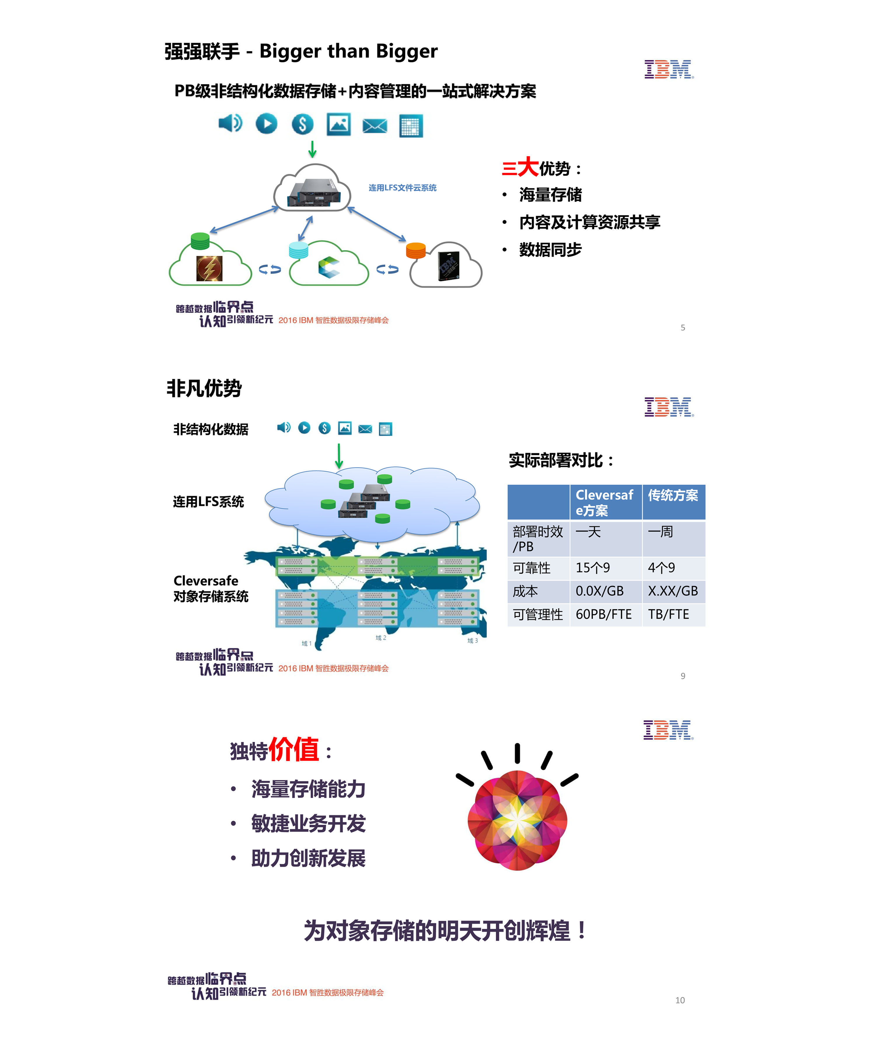 连用科技张哲总经理在长期的客户服务中有着深刻的体会,他提出在金融小额贷款客户资料与管理、办公云网盘数据存储与管理、银行邮件数据归档与管理等一些应用场景中,仅有强大的Cleversafe还是不能完全满足客户对于非结化数据和各项功能要求,例如非结构化数据的格式转换、版本管理、数据安全、归档各份、内容分类、图文及语音检索、内容识别等等,而连用科技的LFS文件云就是国内在非结构化数据管理和协作应用的领先者,在金融、电力、医疗、企业有众多的成功案例,并且早在IBM收购Cleversafe之前,连用就已经有基于Cleversafe相应的解决方案。一种注定的缘由让连用科技成为Cleversafe非结构化数据生态中重要的组成,成为国内首批可以携手IBM为企业提供一站式的PB级非结构化数据存储、管理和内容管理解决方案,帮助企业在浩如烟海的信息中捕获价值,跨越数据临界点, 走进认知商业时代,将信息转化为自身发展的力量。