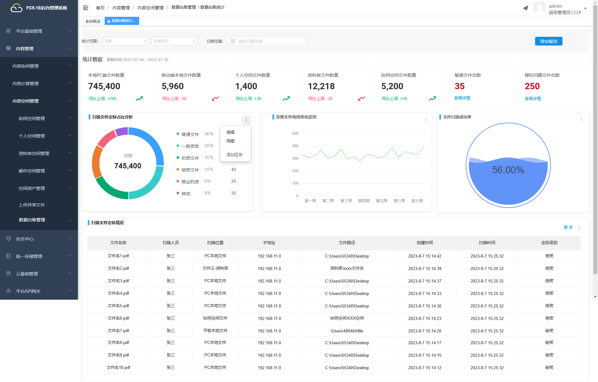 一旦扫描完成,支持按统计范围(部门、人员、日期)自动生成数据台账,还可罗列敏感信息情况、文件数量、文件增长趋势等信息。