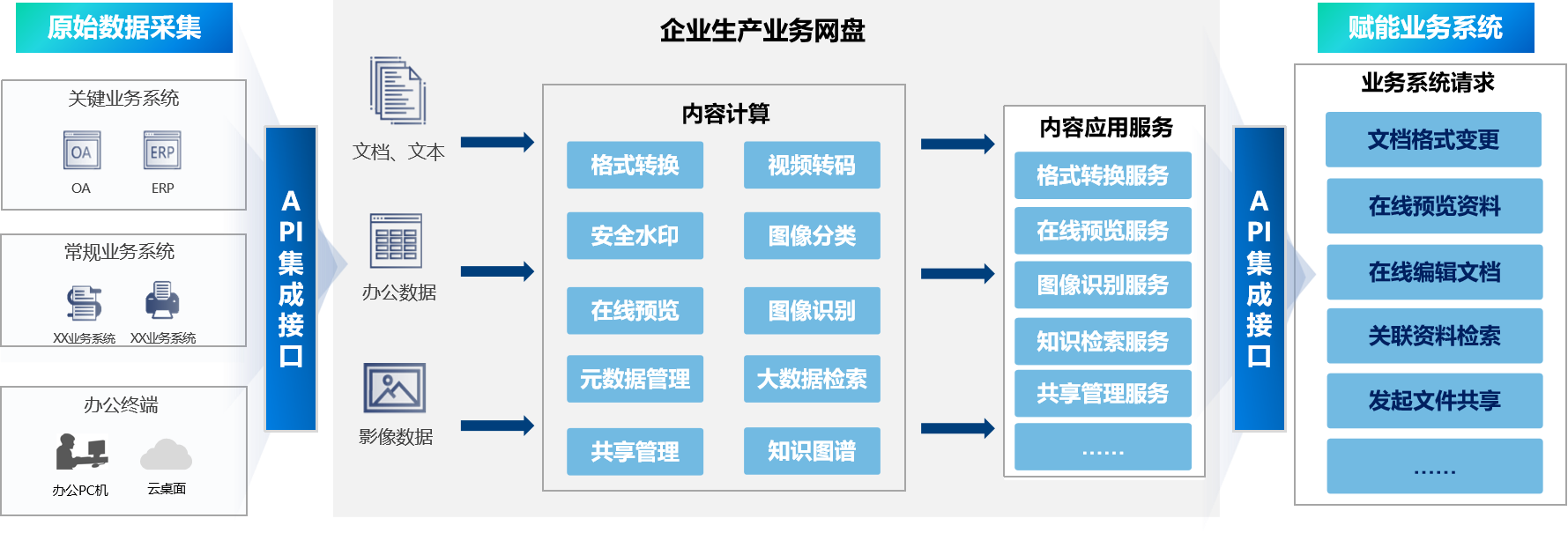 开放/标准的API,为各业务系统调用企业生产业务网盘提供统一便捷的接口,实现对全域非结构化数据的采集汇聚、统一存储、内容管理、办公协同、数据共享、数据安全、数据应用等,实现内容应用赋能业务运营,减少大量的重复建设成本。