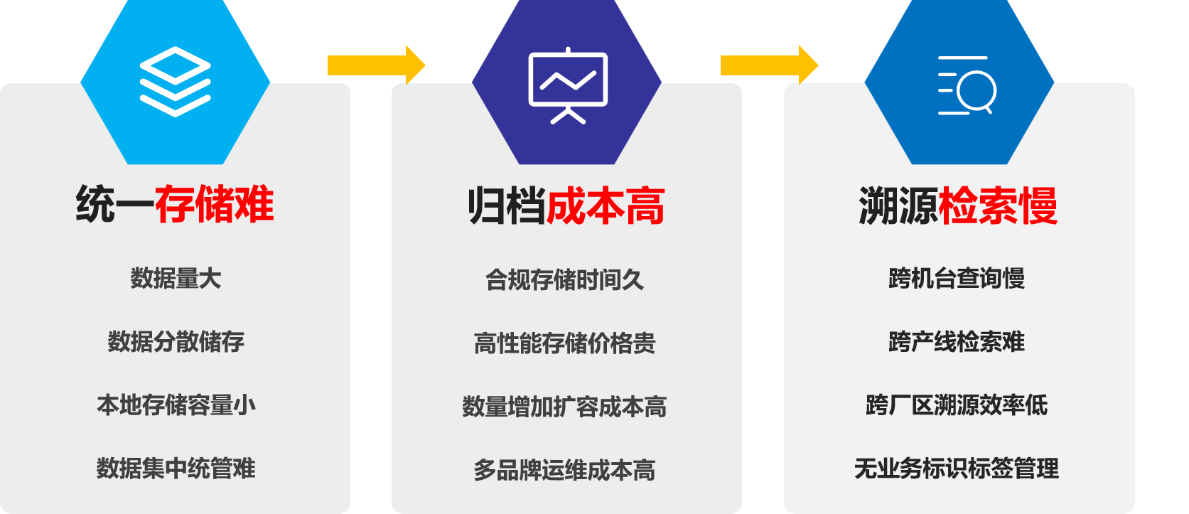 企业产线数据量大,质检数据要求长久归档存储,跨厂区质检溯源效率低是当前困扰工业制造企业的三大难题。
