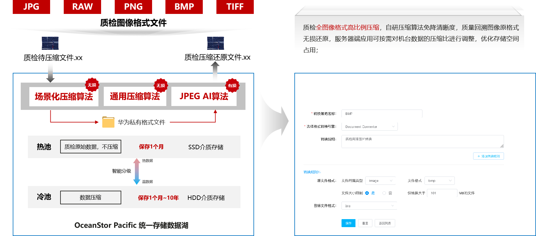 针对海量质检数据华为提供分部署存储解决方案,极致压缩降低成本,通过自研压缩算法,高比例图像压缩,可达到近无损压缩,容量1B可以当4PB。
