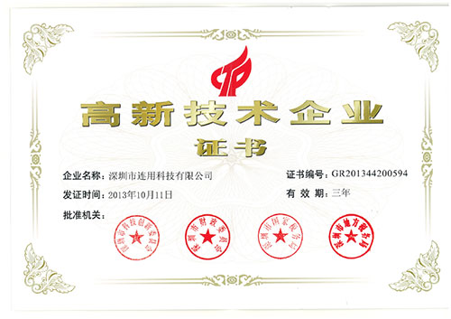 近日,连用科技收到了“深圳市科技创新委员会、深圳市财政委员会、深圳市国家税务局、深圳市地方税务局”联合颁发的国家高新技术企业证书。连用科技在短短一年时间里先后从市级高新技术企业跃升为国家级高新技术企业,再次彰显了公司的实力。