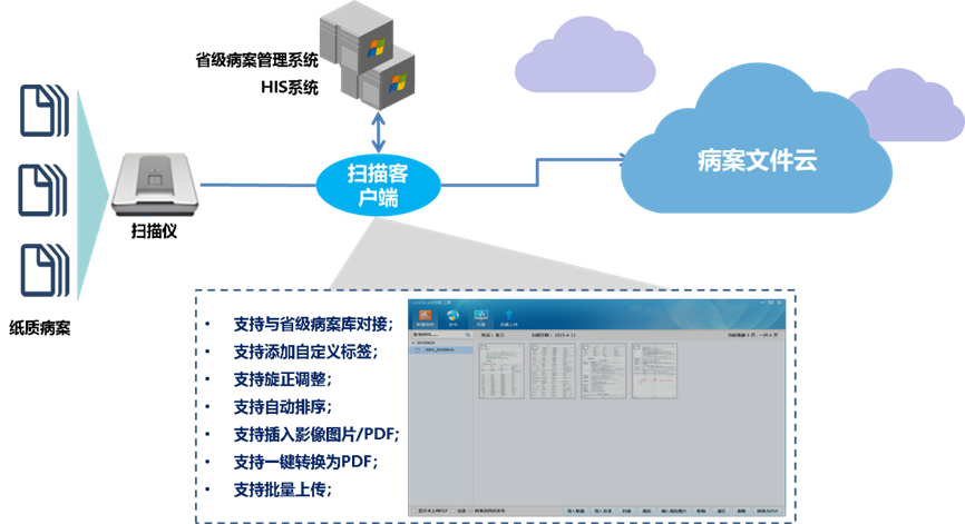构建医院病案文件云,提供来源广泛的各类非结构化数据统一集中存储、管理。可为核心应用系统(HIS/PACS/LIS等)提供数据归档;为泛病历资料的统一集中存储、共享、查阅等;纸质病历电子化管理;病案内容检索、在线浏览、打印管理等。