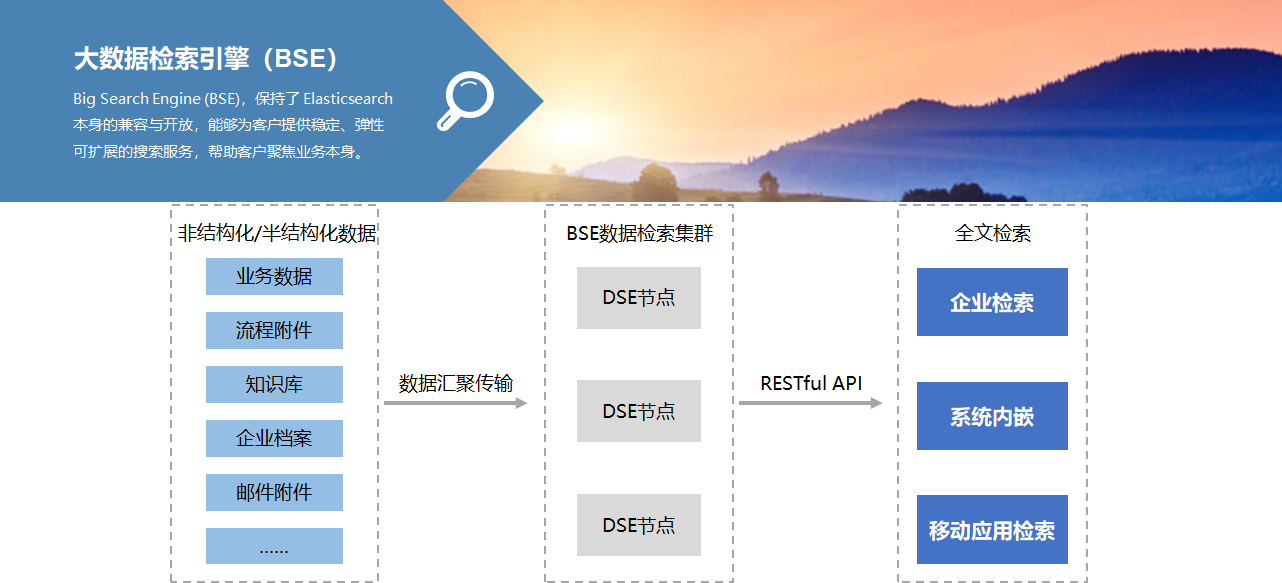 Big Search Engine (BSE),保持了 Elasticsearch 本身的兼容与开放,能够为客户提供稳定、弹性可扩展的搜索服务,帮助客户聚焦业务本身。