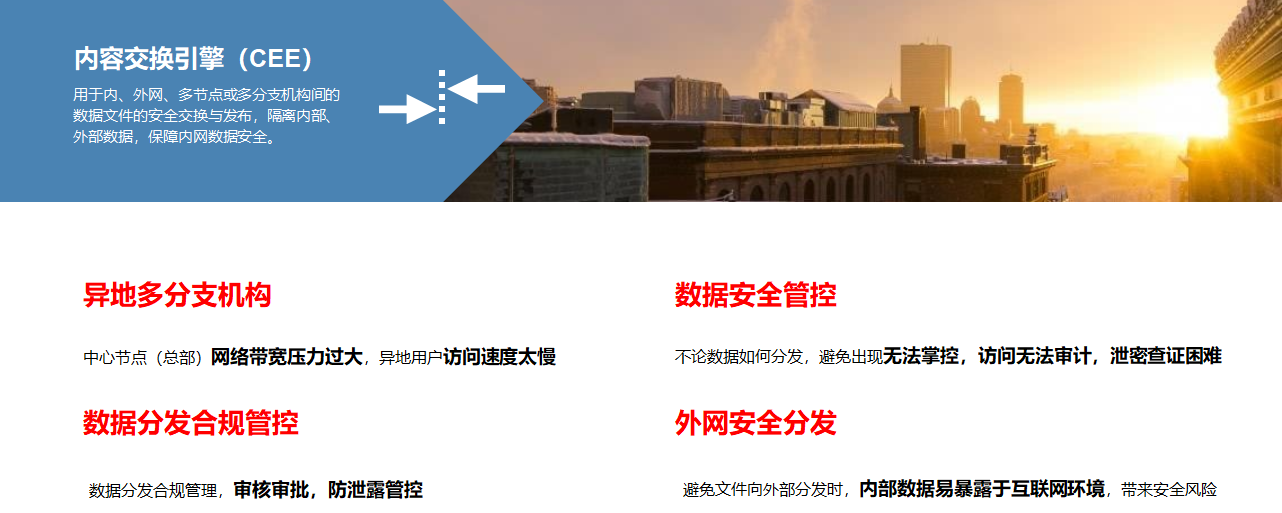 用于内、外网、多节点或多分支机构间的数据文件的安全交换与发布,隔离内部、外部数据,保障内网数据安全。