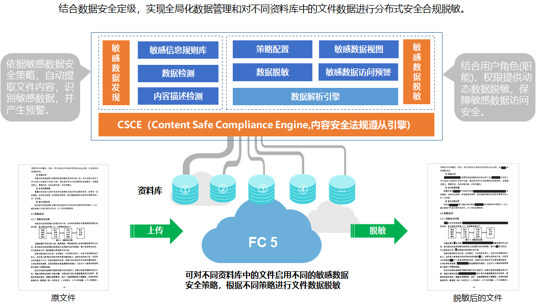 结合数据安全定级,实现全局化数据管理和对不同资料库中的文件数据进行分布式安全合规脱敏。