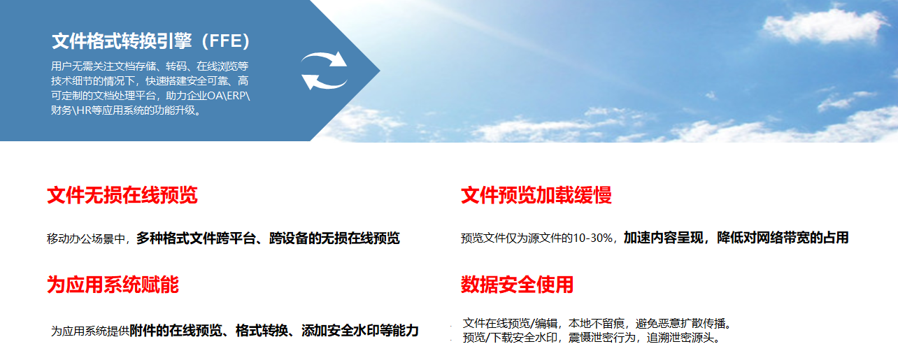 用户无需关注文档存储、转码、在线浏览等技术细节的情况下,快速搭建安全可靠、高可定制的文档处理平台,助力企业OA\ERP\财务\HR等应用系统的功能升级。
