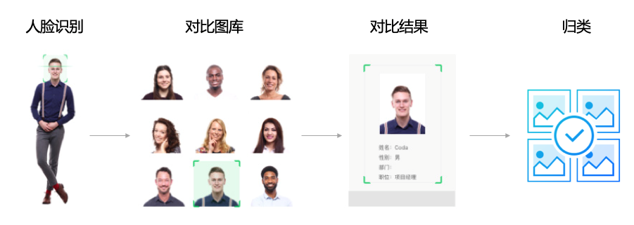 支持图像中准确检测人脸、分析人脸关键点信息、获取人脸属性,支持识别不同年龄、性别、服饰等属性的人群、实现人脸的精确比对和检索,对同一人物进行聚合归类管理。