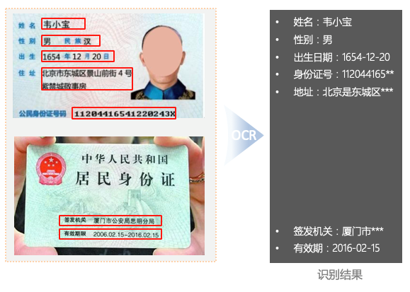 自动从图片中定位需要识别的图片区域,识别出其中包含的信息。可识别包括身份证、护照、银行卡、名片、户口簿等卡证图片......