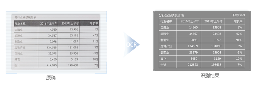 识别表格及表格内容,结构化输出表头、表尾及每个单元格的文字内容帮助您快速便捷地完成纸质报表单据的电子化。