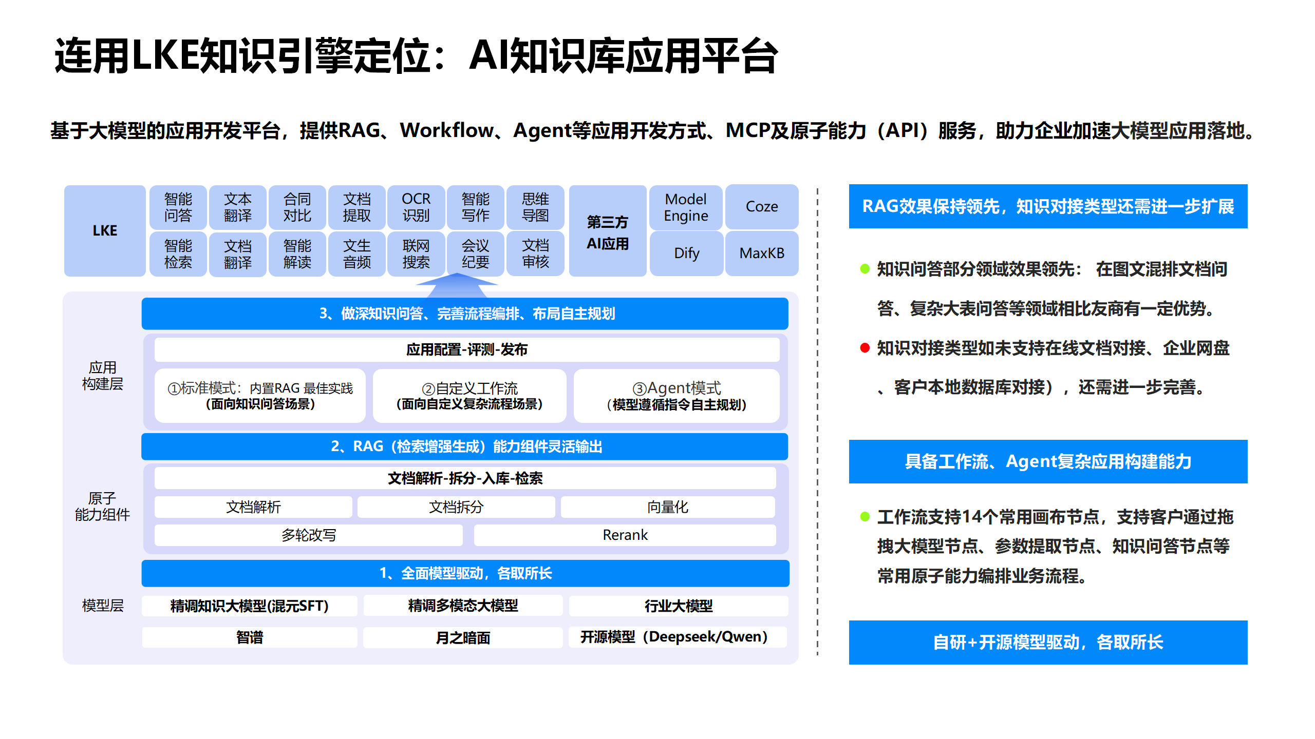 基于大模型的应用开发平台,提供RAG、Workflow、Agent等应用开发方式、MCP及原子能力(API)服务,助力企业加速大模型应用落地。