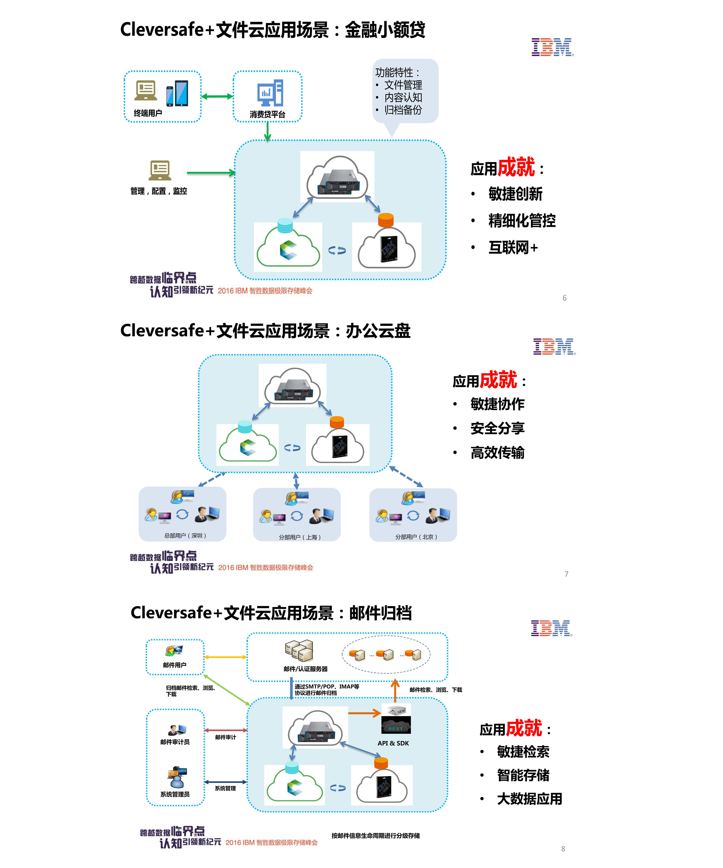 连用文件云结合IBM CleverSafe在金融小额贷款客户资料与管理、办公云网盘数据存储与管理、银行邮件数据归档与管理等场景中得到了很好的运用,这是IBM对象存储首次在中国展示的案例之一。基于IBM Cleversafe+连用文件云架构的应用存储系统价值在于:提供海量文件级存储能力,强力支持移动业务的高速发展,实现更敏捷的创新业务开发, 挖掘数据信息本身的应用价值!