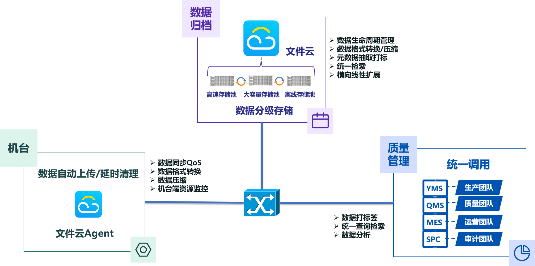 统一存储管理多个厂区、产线的数据,支撑多机台接入,实现应用和存储的线性扩容,满足数据长期保存的合规性要求