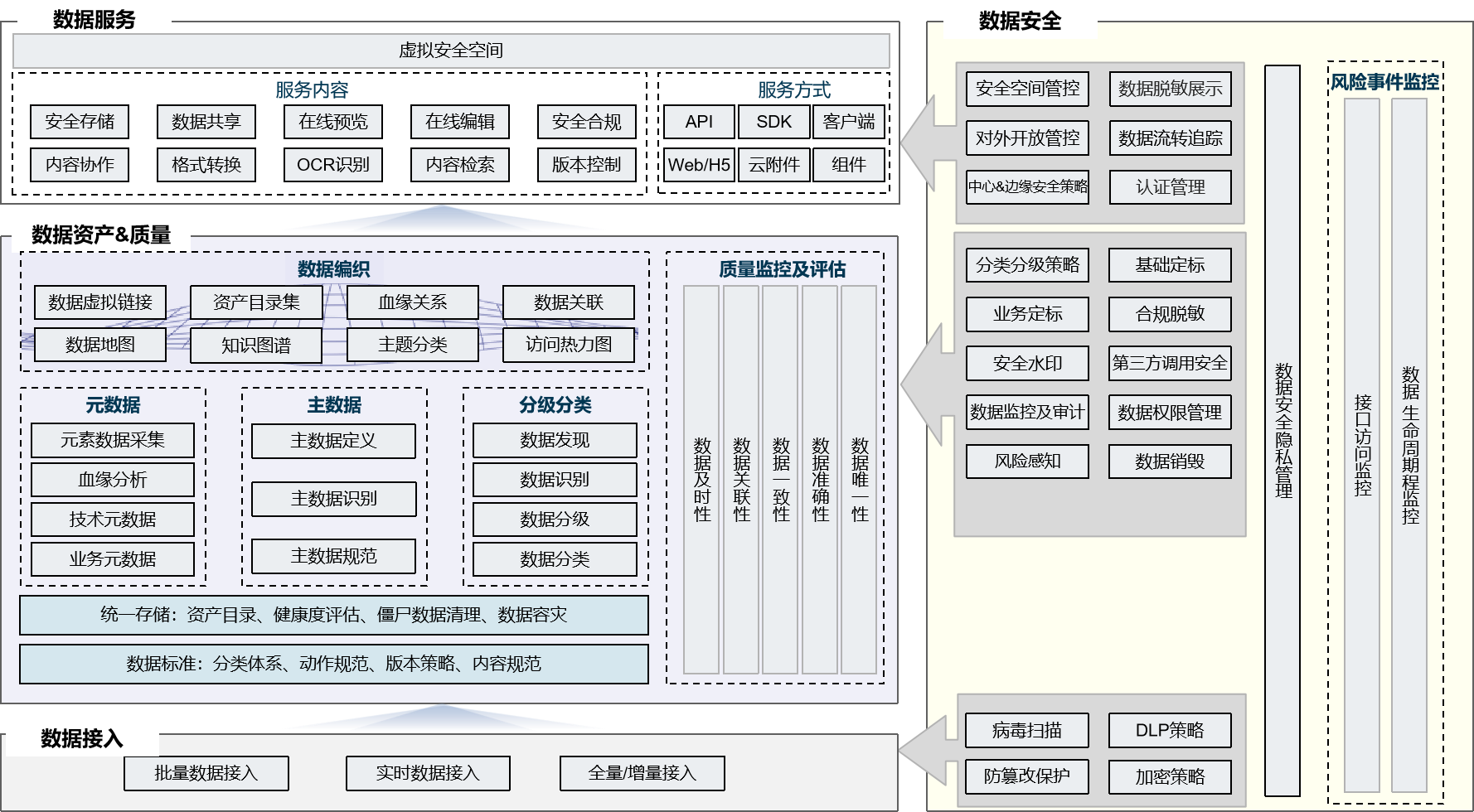 开放/标准的API,为各业务系统调用企业生产业务网盘提供统一便捷的接口,实现对全域非结构化数据的采集汇聚、统一存储、内容管理、办公协同、数据共享、数据安全、数据应用等,实现内容应用赋能业务运营,减少大量的重复建设成本。