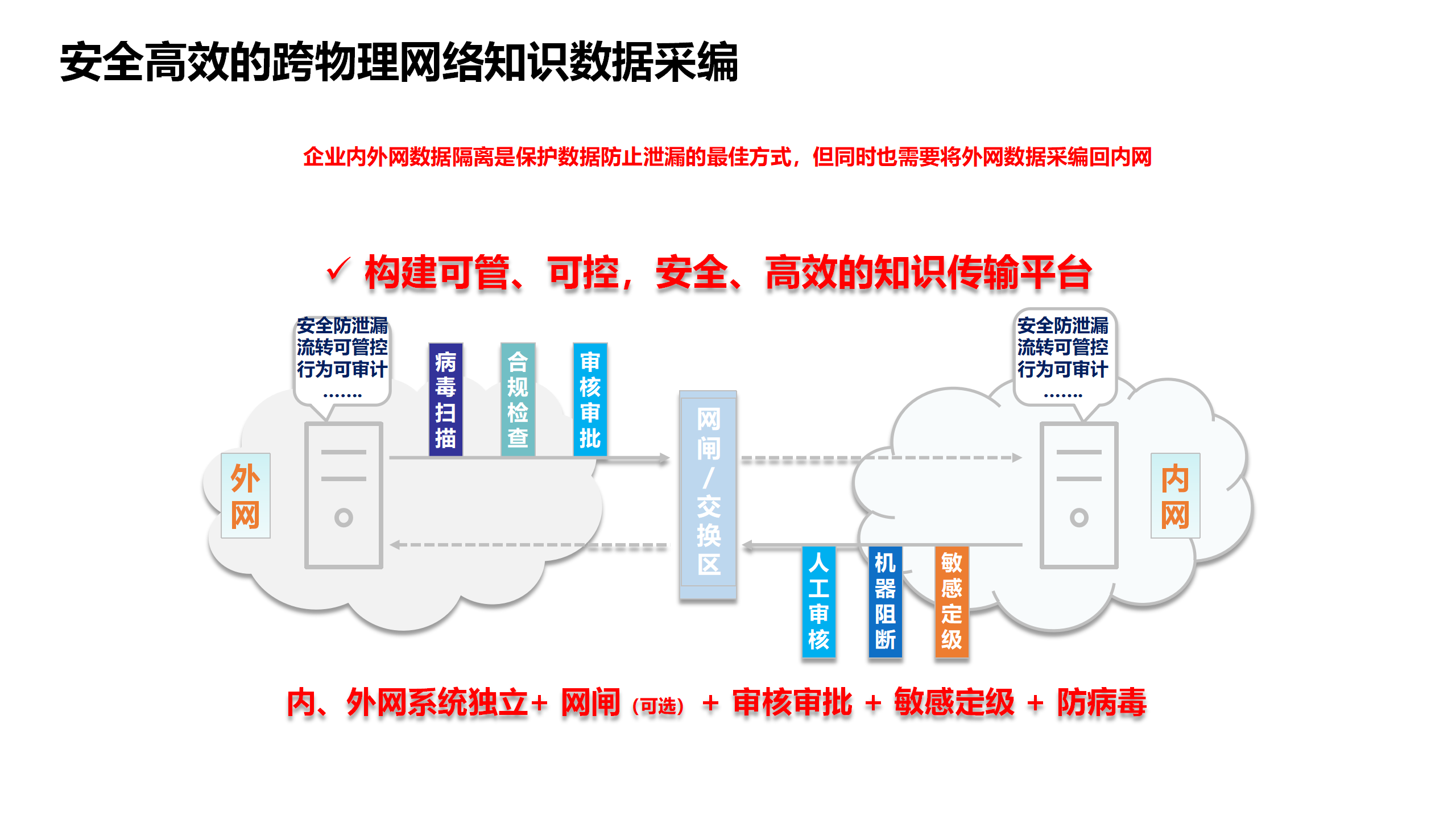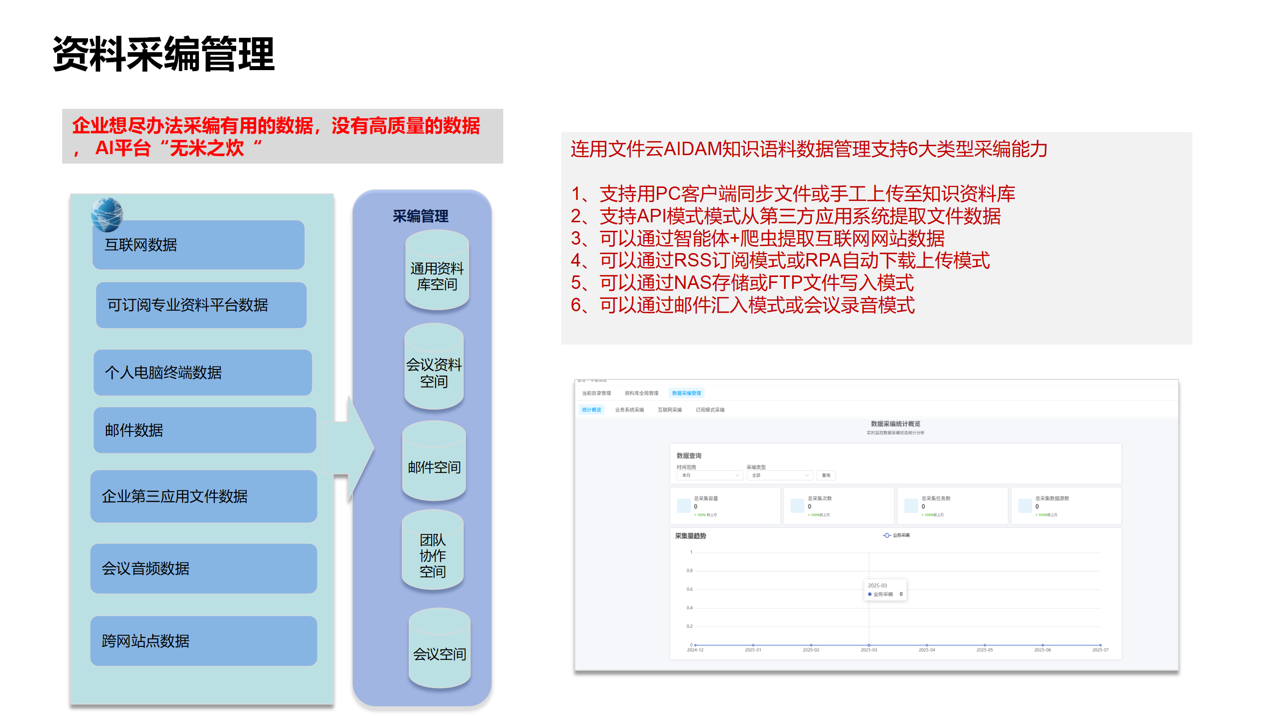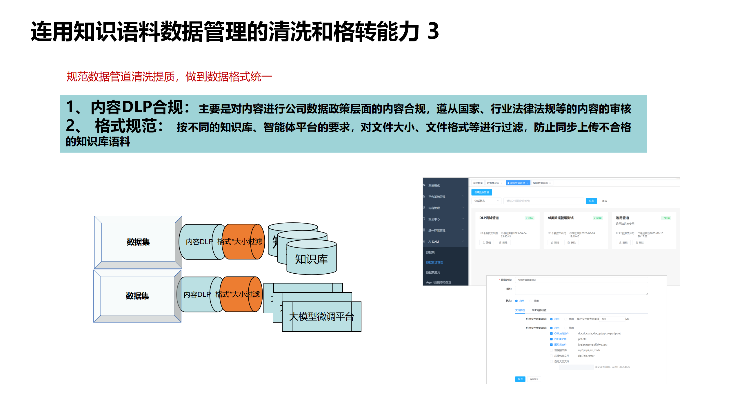 一体化能力的从实现知识语料的在采集、在线编辑、审批入库能力到生成数据集到数据管理清洗、数据合规审核,最终推送给知识库。实现从知识语料到知识的及时生效全自动化流程,真正实现数据AI知识库应用的自动化生产流程。